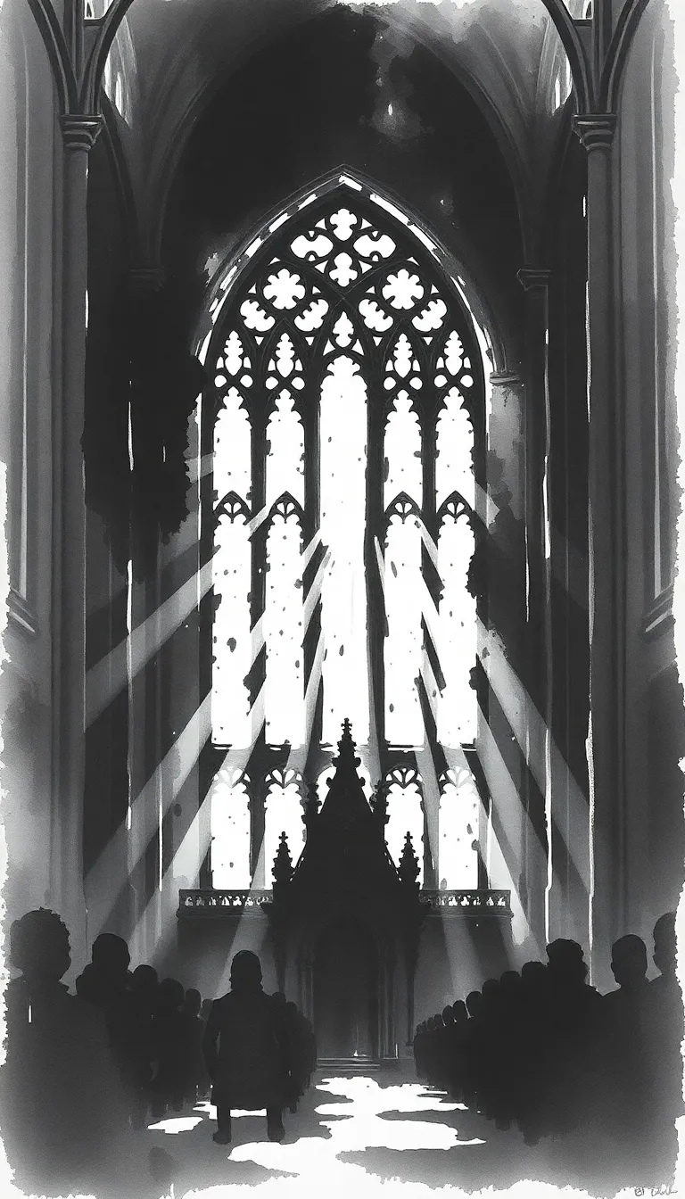 Drifts through stained glass sorrows, a captive soul doth lie.