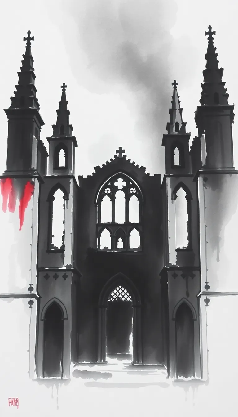 Dawn finds the cathedral slumped in ash, its spires fingers charred,