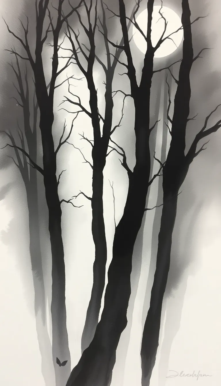 The trees stand like sentinels, cloaked in the night.