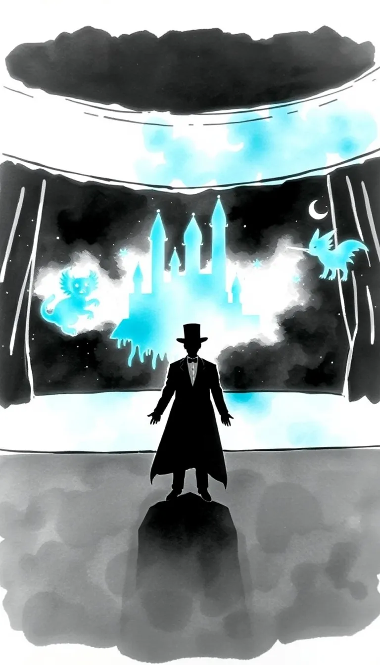 The echoes of doubt became a companion during a long night of solitary walks through empty corridors and echoing halls. Every step was reminiscent of the applause that had once filled his ears and warm memories of rapturous admiration. Yet now, the silence seemed to question the nature of his art. The magical illusions he invoked, though dazzling to the eye, reflected back a facet of his soul that was both luminous and troubled. In the interplay of black and white, against a backdrop now touched softly by crimson rather than the usual exuberance, the Maestro saw his inner conflict mirrored in the ephemeral shapes of his conjurations.